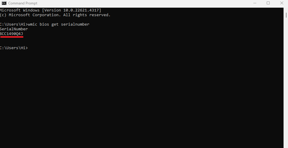 Trong cửa sổ màu đen hiện ra, gõ chính xác dòng lệnh "wmic bios get serialnumber" rồi nhấn Enter: