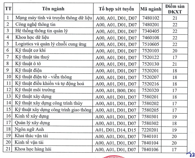 Một số ngành lấy điểm xét tuyển từ 17 điểm gồm: Kỹ thuật tàu thủy; Kỹ thuật môi trường; Khoa học hàng hải...